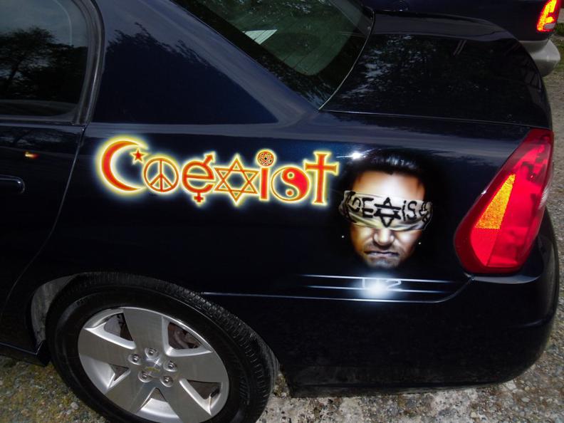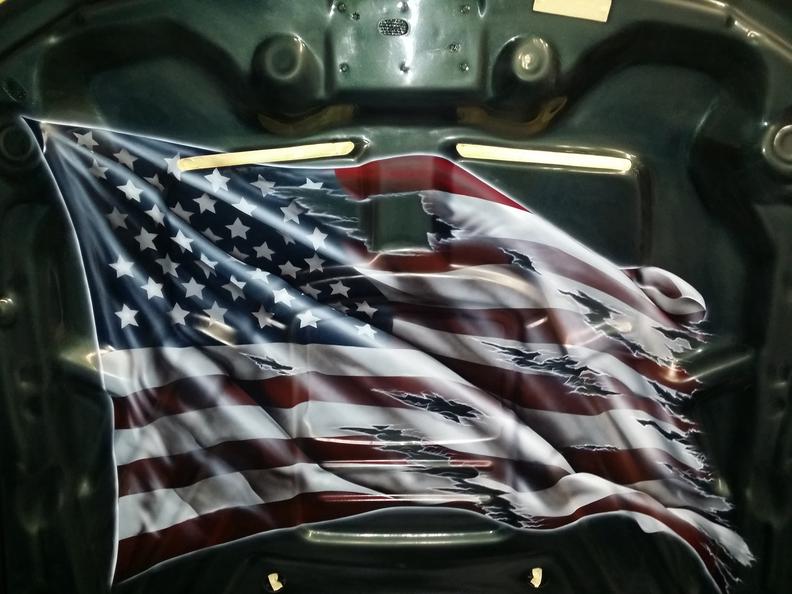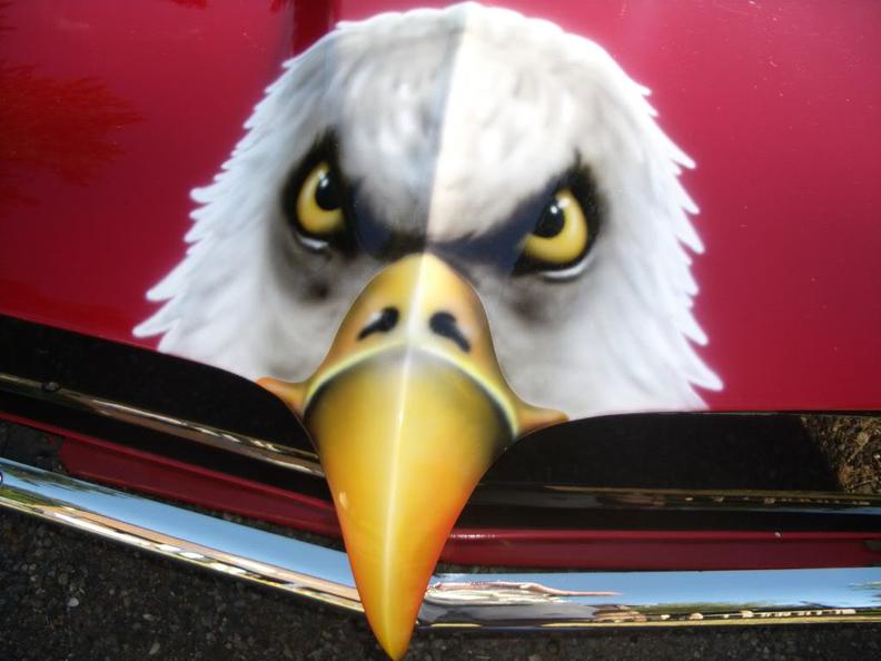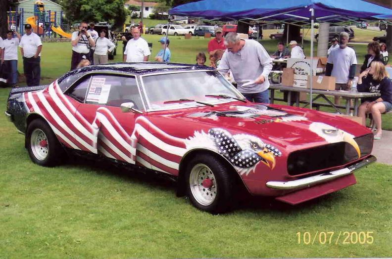 Painted this 68 Firebird day after 911. I already had the fabricated bird beak on the front, for a planned Firebird theme. However, after the towers were attacked, I felt the need to change the design.