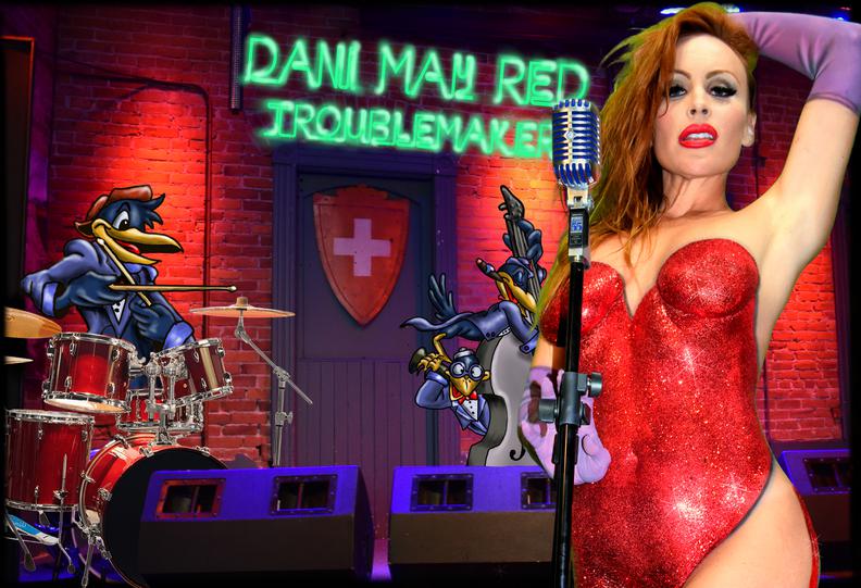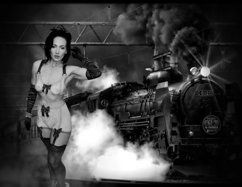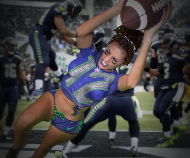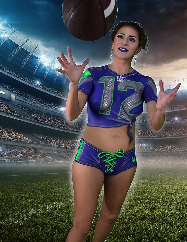 Model Calista Marie in body painted lingerie which includes painted gloves and stalkings.